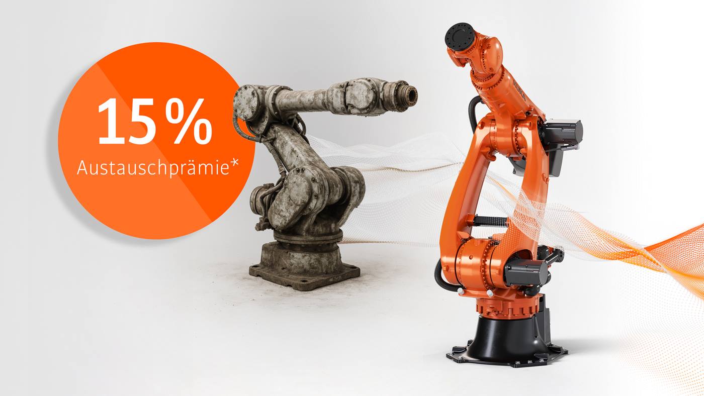 Sie setzen noch auf veraltete Robotertechnologie? Jetzt ist der perfekte Zeitpunkt für ein Upgrade! Mit der exklusiven KUKA Austauschprämie erhalten Sie 15% Sonderrabatt*für alle Bestellungen bis 31.12.2025beim Austausch ihres alten Roboters – zusätzlich zu bestehenden Vereinbarungen.