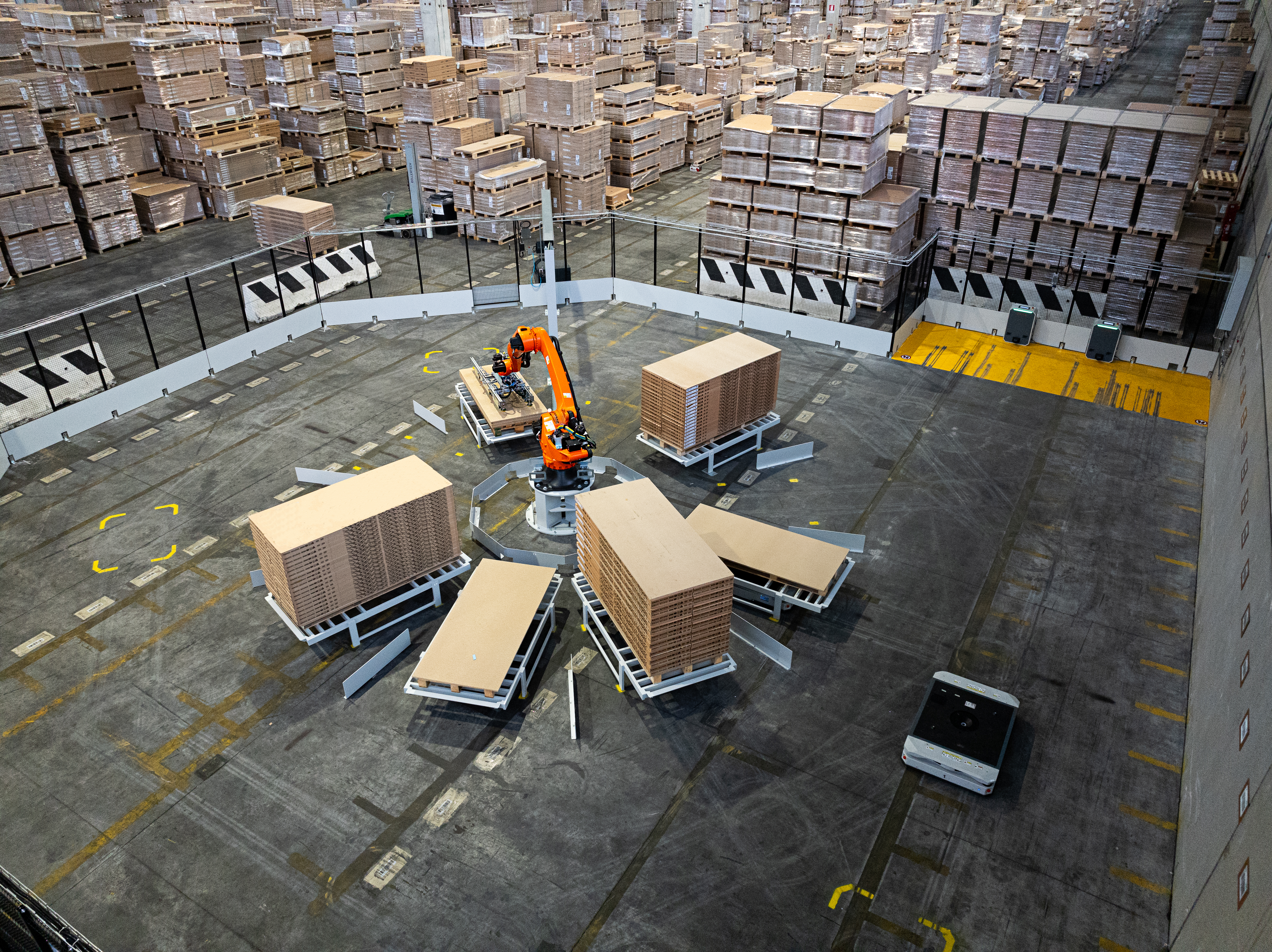KUKA zeigt auf der LogiMAT 2026 nicht nur, was in der Zusammenarbeit mit Partnern bereits heute und in Zukunft möglich ist, sondern präsentiert selbstverständlich auch das eigene Portfolio. Auf einer rund 75 Quadratmeter großen Fläche im unteren Teil der Arena wird dabei die Interaktion zwischen AMRs und stationärer Robotik sichtbar: Auf einem Sockel stehend wird ein KR IONTEC Kartons auf Paletten stapeln, die von mobilen Robotern wie der KMP 250P oder KMP 600P transportiert werden. Implementiert wird dieser Aufbau von KUKA Systempartner FPT Robotik. Die mobilen Roboter werden aber nicht nur auf dem Bereich von KUKA fahren, sondern auch auf der angrenzenden Fahrfläche des Partner-Showcases unterwegs sein.