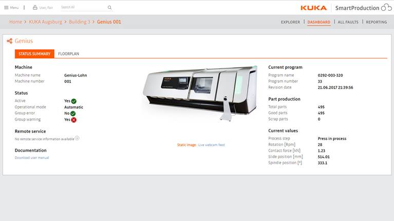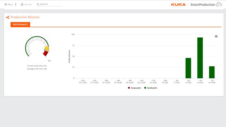 Production lines consist of numerous sensors, actuators, network components, and lots more. Virtually all these integrated “things” are potentially valuable information providers, since processes depend on the interaction of various components and peripheral properties. If the aim is to use data not only to optimize individual components, but also to increase process quality, they must be intelligently processed and visualized together. KUKA SmartProduction gives system operators access to the information of process-relevant machines for evaluation – in compliance, of course, with the highest security standards and clear data association.