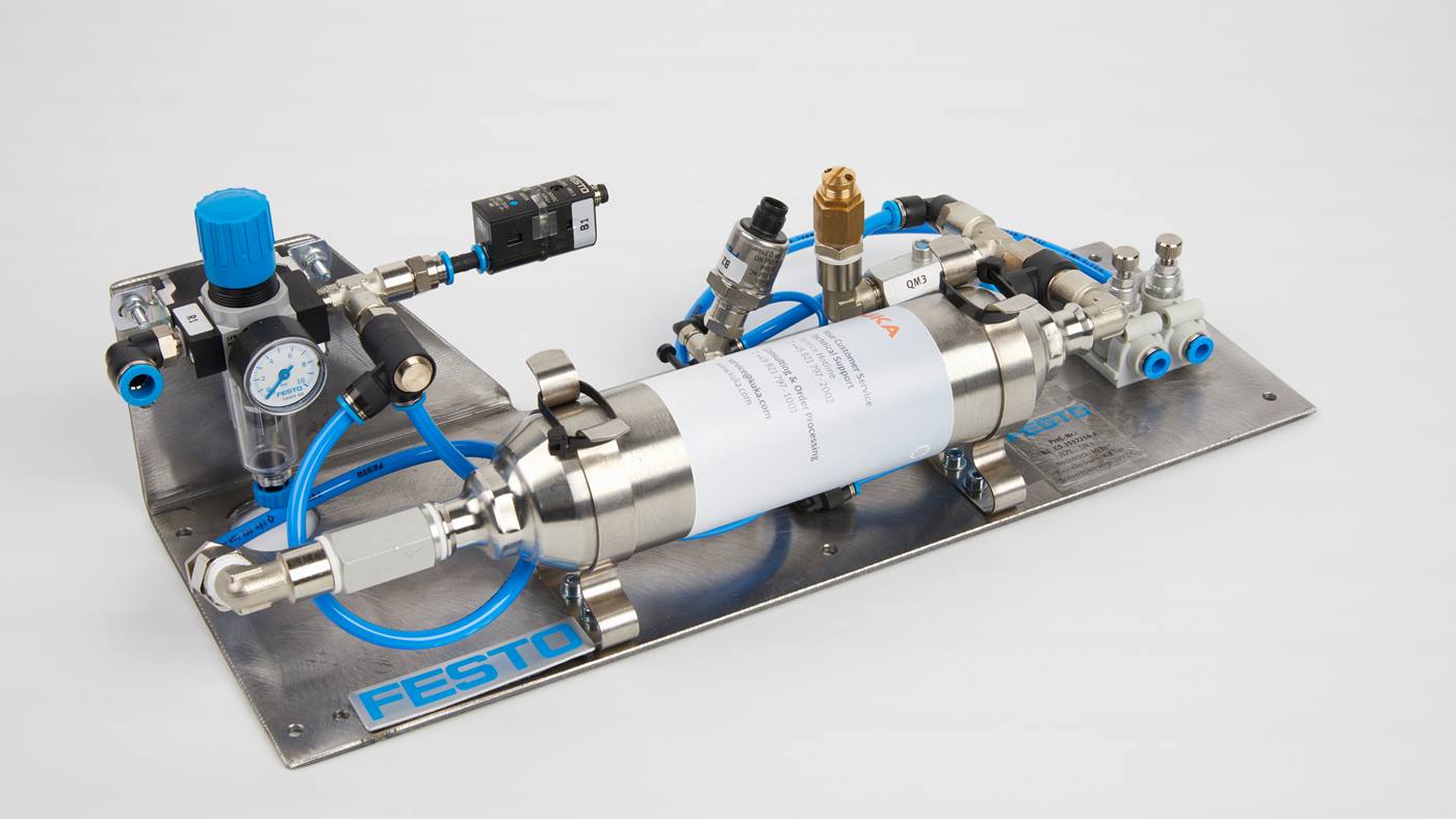 The pneumatic components are delivered pre-assembled on a mounting plate.