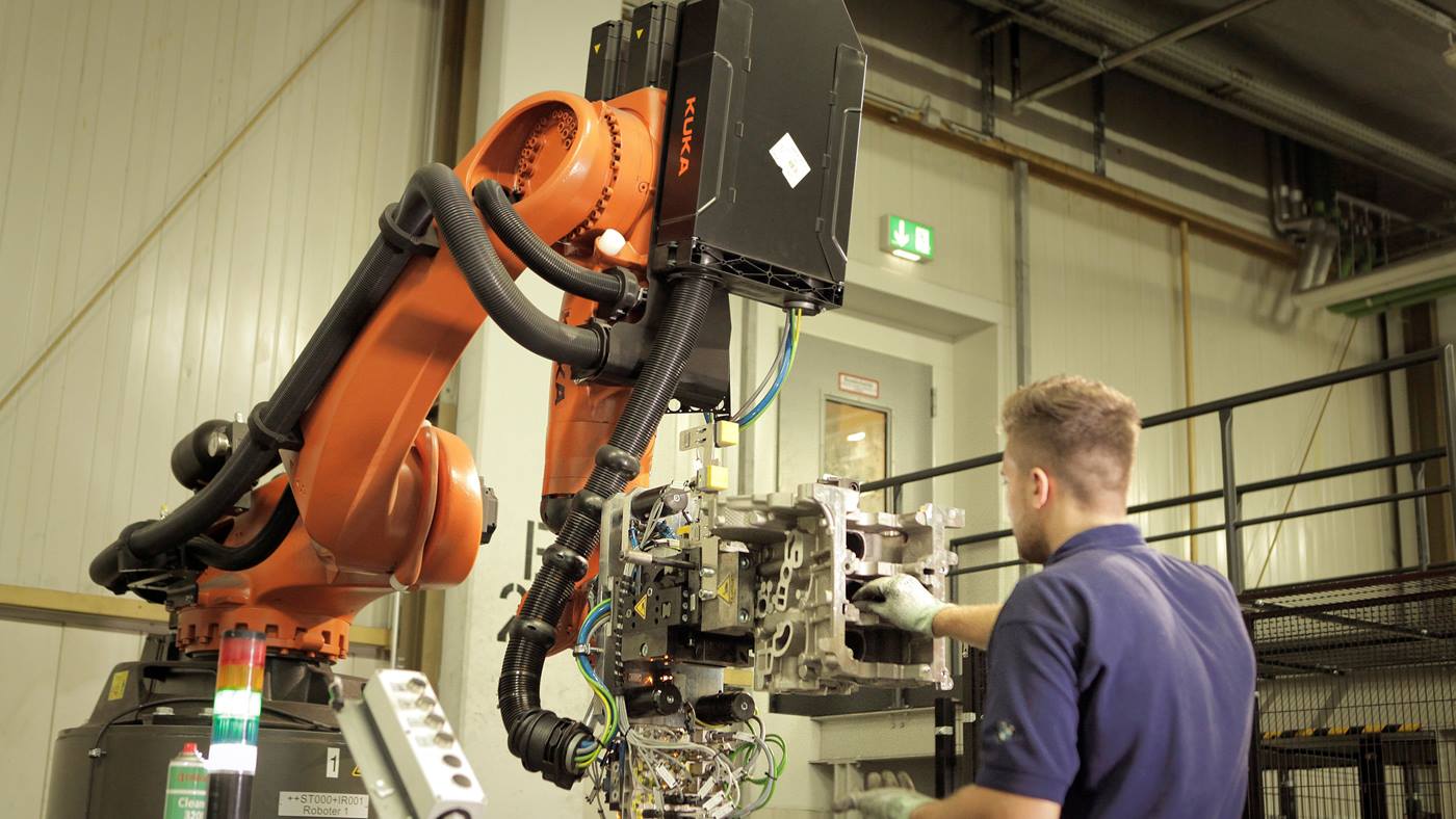 L'usine du groupe BMW de Landshut possède l'une des fonderies d'alliages légers les plus modernes au monde. Qu'il s'agisse de moteurs à trois, quatre ou six cylindres, les carters de tous les modèles de la flotte BMW sont fabriqués ici. L'assurance qualité des carters ne peut pas être entièrement automatisée car le regard de spécialiste du collaborateur demeure indispensable. La décision a donc été prise pour une installation dans laquelle homme et robot travaillent ensemble. L'entreprise MRK-Systeme a été chargée de la mise en œuvre. "La collaboration homme-robot permet un soulagement ergonomique des collaborateurs de BMW", déclare Michael Mohre, responsable du secteur Operations à l'entreprise MRK-Systeme GmbH. Depuis maintenant un an et demi, deux applications identiques avec respectivement un robot KUKA de la série KR QUANTEC de type KR 210 R2900 prime K - le modèle à console - sur la ligne de production de Landshut. Un collaborateur respectivement commande à l'aide d'un joystick les mouvements du robot, afin de contrôler les défauts des composants avec une posture corporelle agréable.