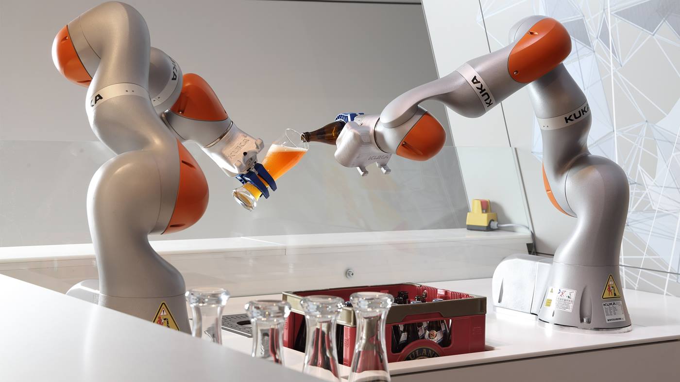 The LBR iiwa gets into the act as a bartender at the trade fair