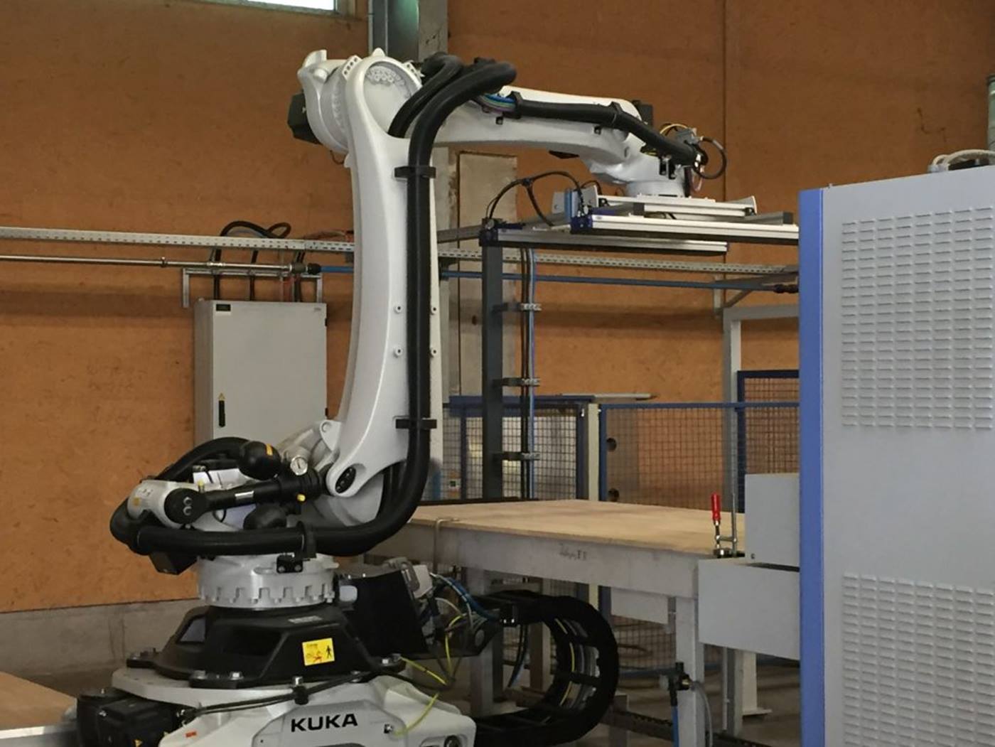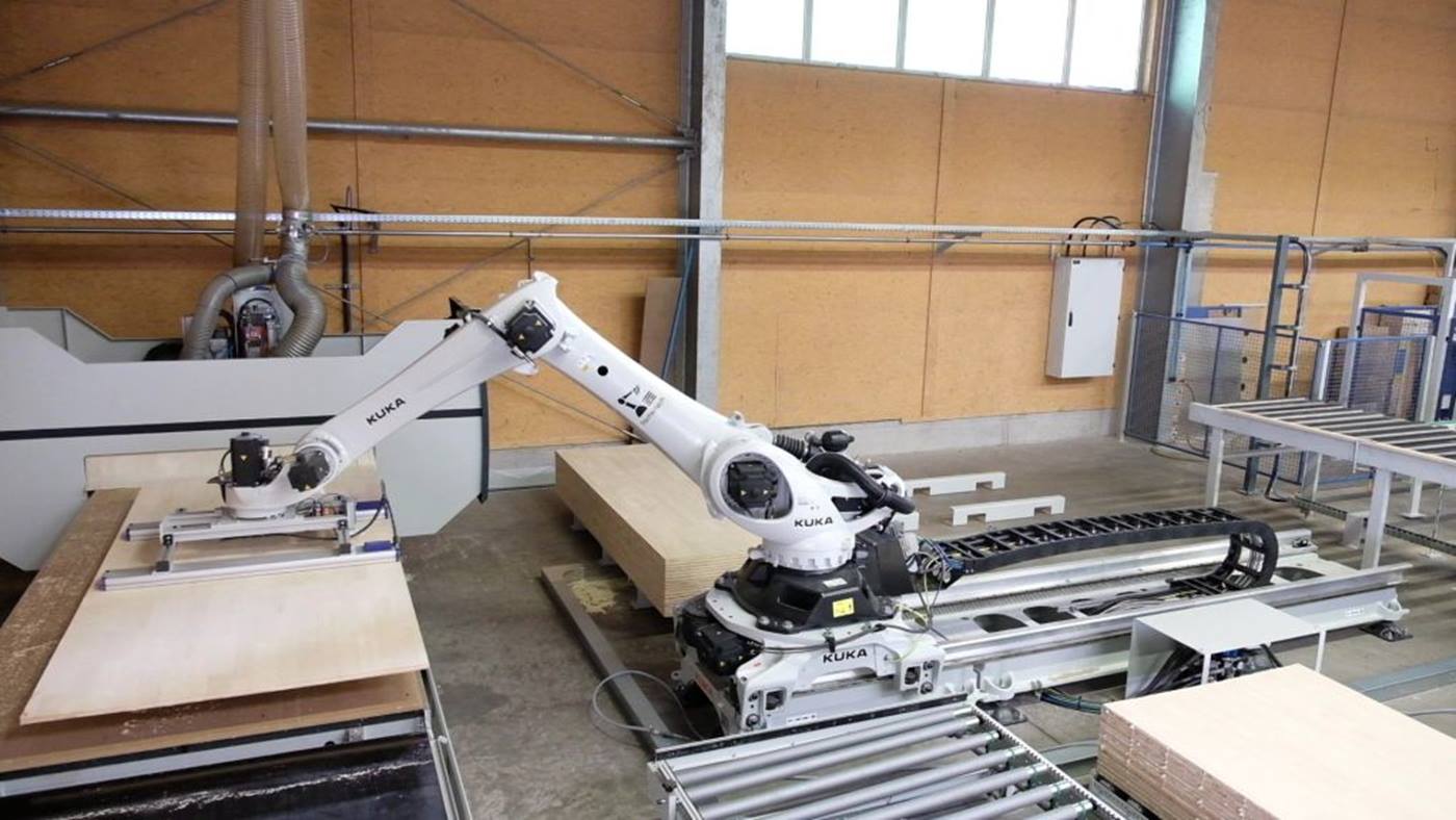 Nakladanie do drevospracujúceho stroja pomocou robotov KUKA zaznamenalo úspech