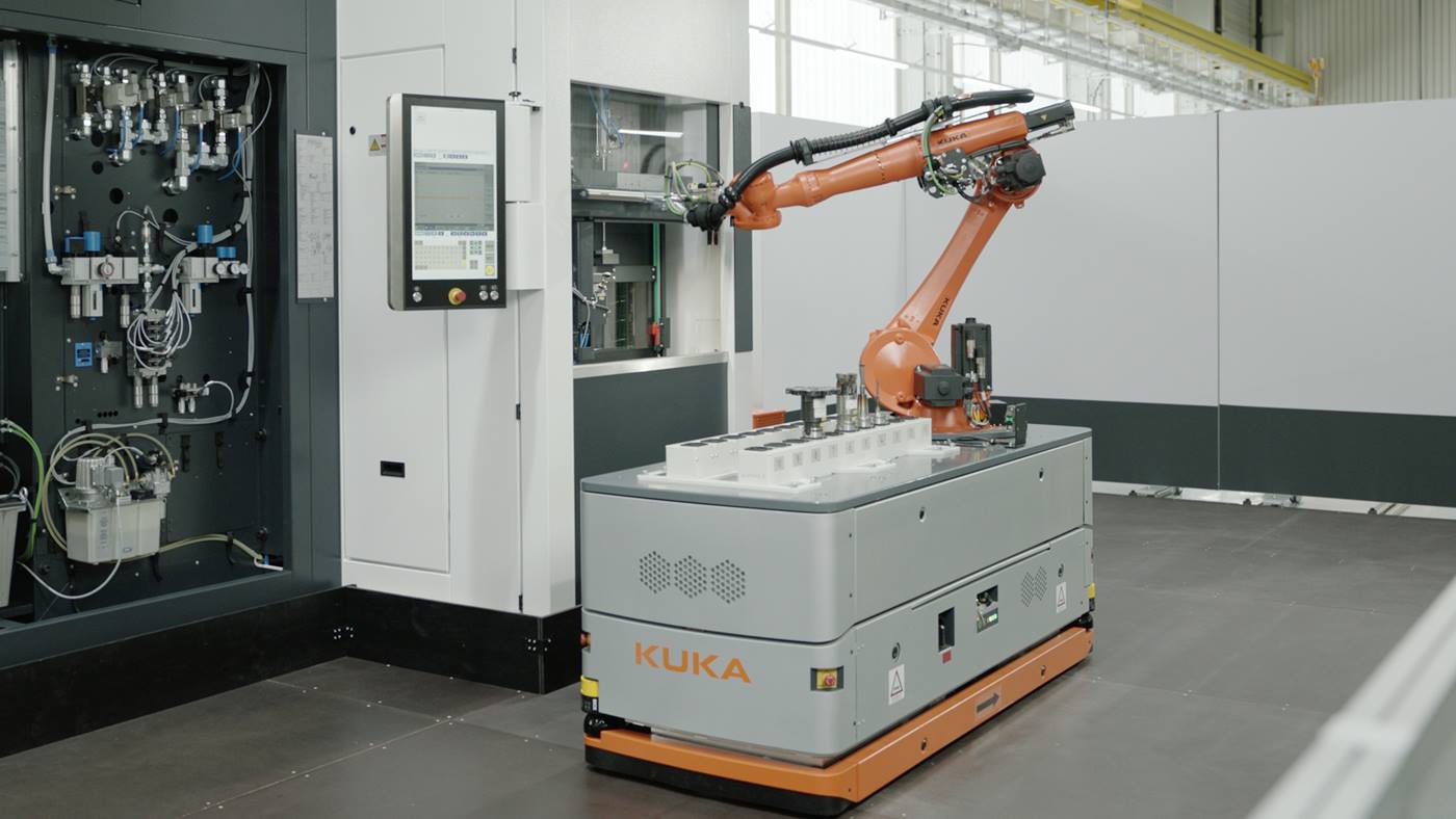 KUKA will team up with System Partner Waybo to showcase a mobile solution for the tending of machine tools. This cell will utilize a KMR CYBERTECH mobile robot, consisting of a KMP 1500 mobile platform and KR CYBERTECH.