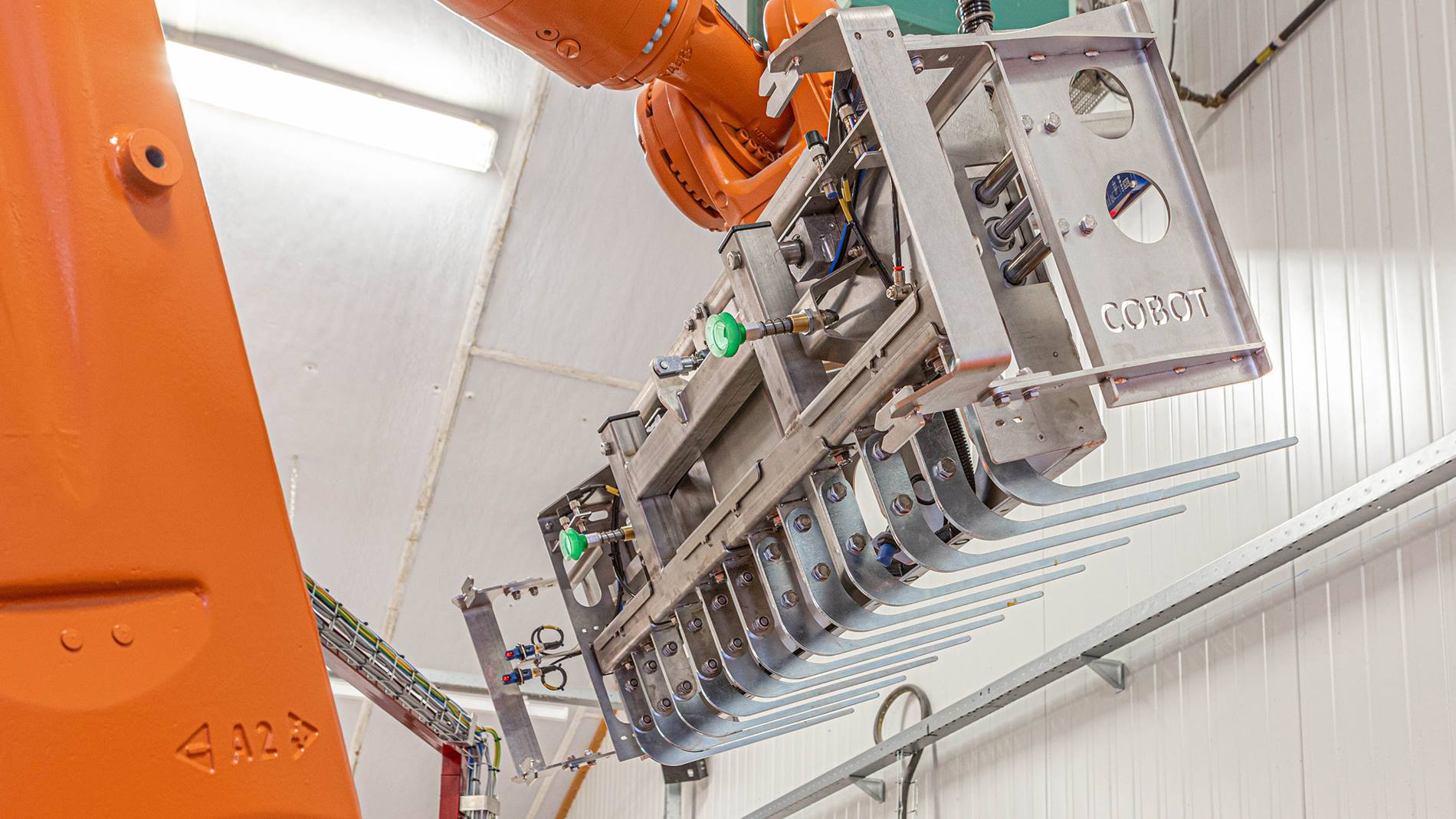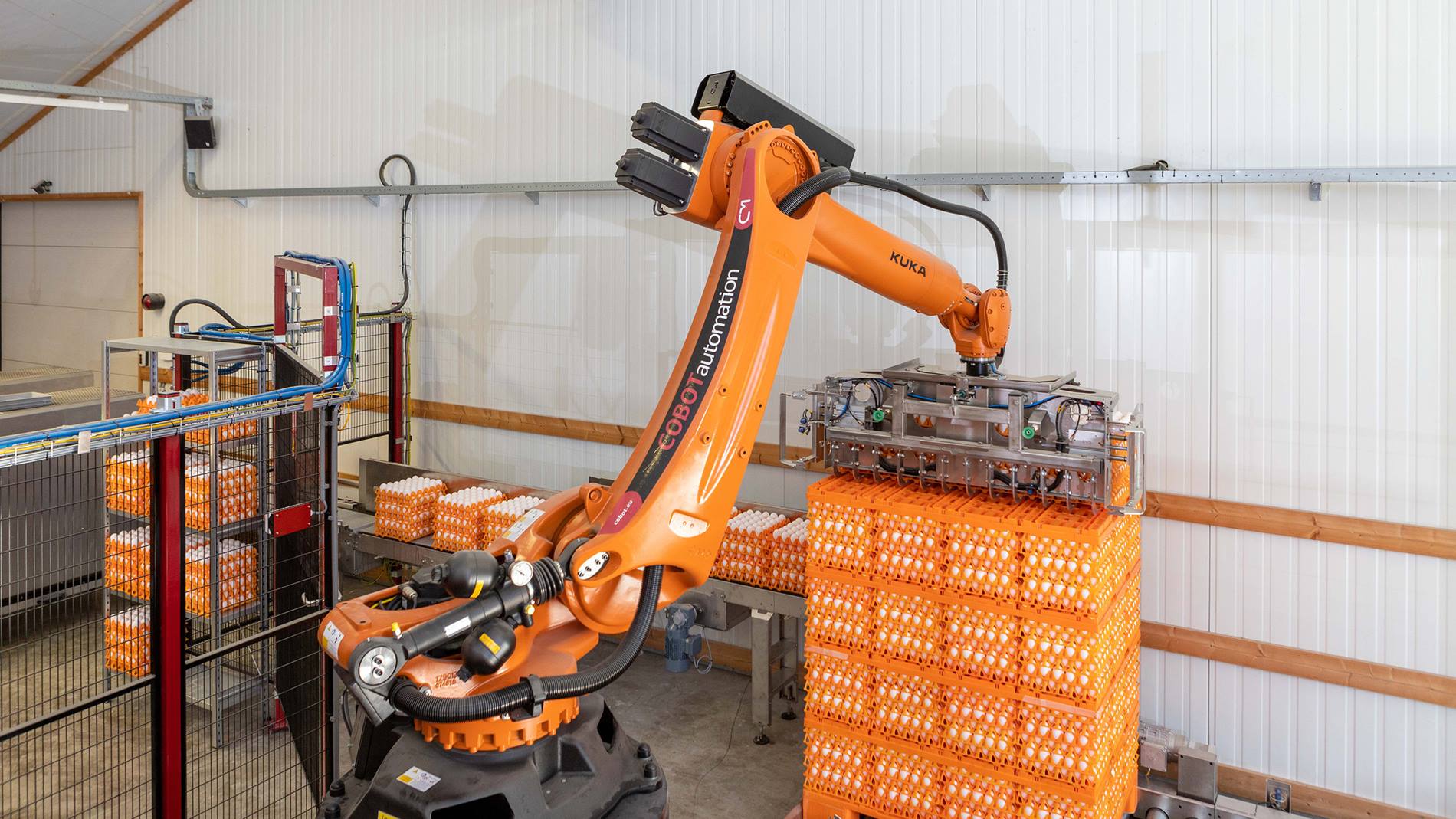 Meggson, kendi bünyesinde geliştirilen diğer sistemlere ek olarak, merkezinde özel gripper'lı bir KR QUANTEC bulunan otomasyon çözümleri de sunmaktadır. KUKA paletleyici, son derece esnek bir hücre tasarımını mümkün kılmak için yeterince kompakt bir yapıya sahiptir ve ayrıca hassasiyet ve erişim çapıyla etkileyicidir. Gripper'lar karton, selülozik ve plastik gibi farklı malzemeleri işleyebilecek şekilde tasarlanmıştır. Yumurtalar paletlenebilmekte, boş kuluçka makineleri veya yumurta tepsileri taşıma arabalarına yerleştirilebilmekte veya bir taşıma bandına koyulabilmektedir. Lazer sensörleri sayesinde robotlar ilgili yükleri nereden alacaklarını bilmektedir.